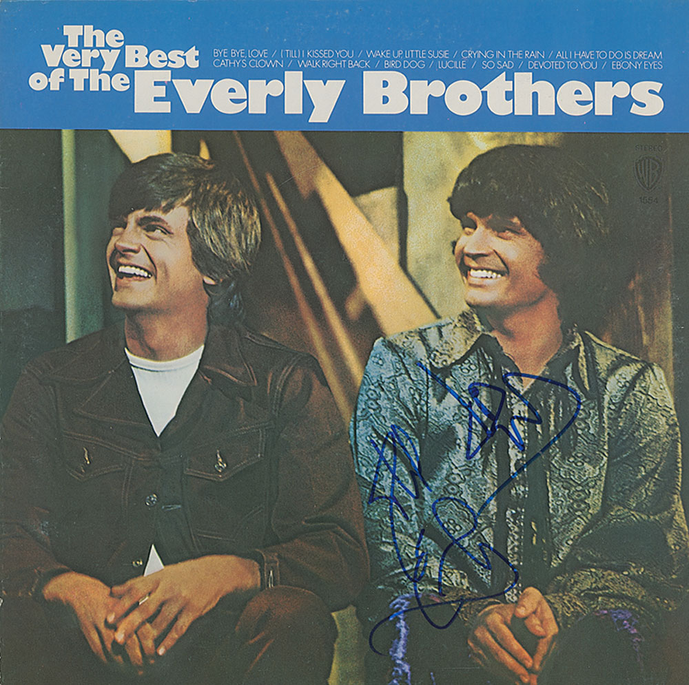 The Very Best of the Everly Brothers album signed on the front cover in blue felt tip by Phil and Don Everly. In fine condition, with a bit of scattered light edge wear. The record is not included. Pre-certified Roger Epperson/REAL and RR Auction COA.