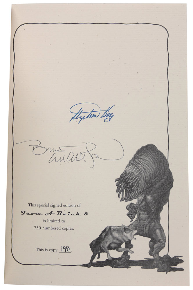 Signed book: From a Buick 8. Limited edition of 750 copies (this being No. 198). Maryland: Cemetery Dance Publications, 2002. Hardcover with dust jacket, 7.5 x 10.25, 408 pages. Signed on the colophon in blue ink by King and also signed by Bernie Wrightson. In very fine condition. Book comes in its original clamshell box. RR Auction COA.