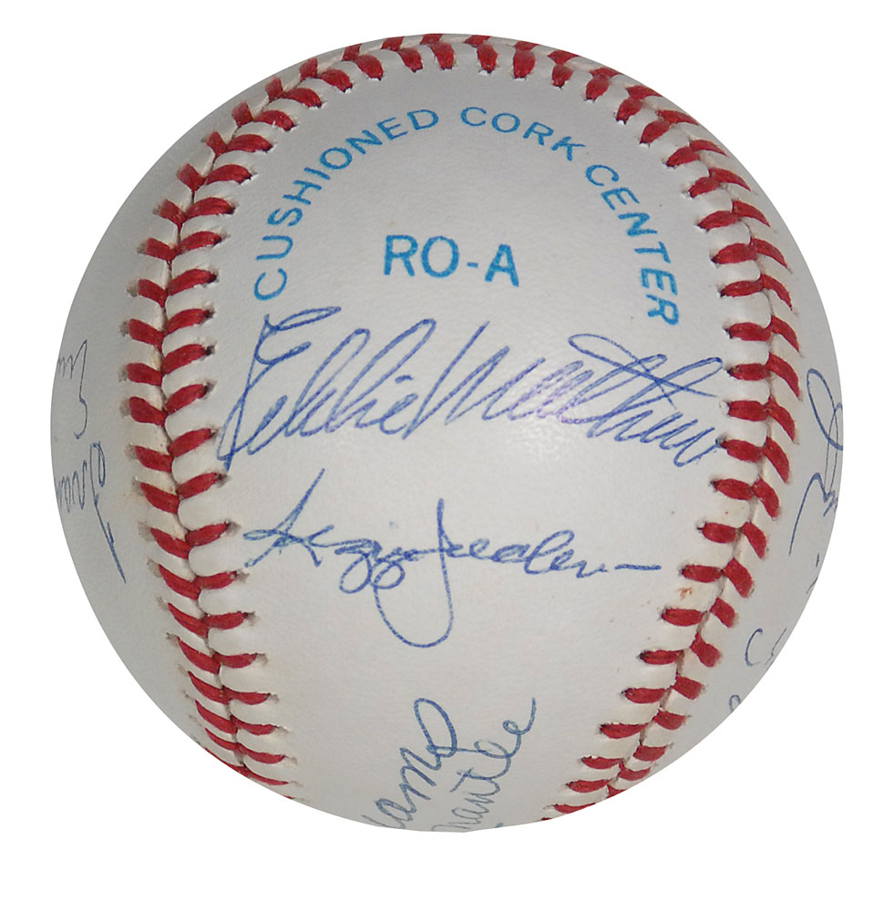 Official Rawlings American League baseball signed in blue ballpoint by 11 members of the 500 Home Run Club: Ted Williams and Mickey Mantle (on the sweet spot), Hank Aaron, Willie McCovey, Reggie Jackson, Eddie Mathews, Frank Robinson, Ernie Banks, Willie Mays, Harmon Killebrew, and Mike Schmidt. In fine condition. Pre-certified Steve Grad/PSA/DNA and RR Auction COA.