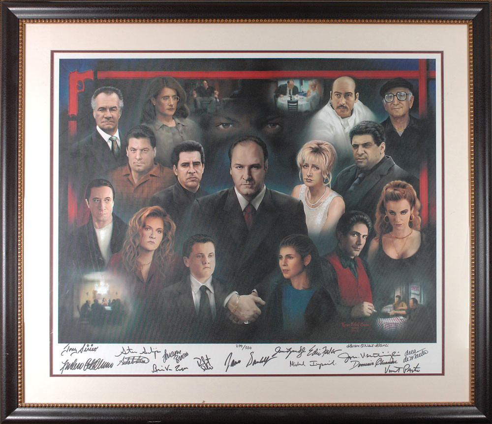 Color limited edition 36 x 31 canvas print, numbered 299/500, signed in the lower border in black felt tip by all 15 pictured cast members: James Gandolfini, Tony Sirico, Steve Van Zandt, Robert Iler, Vincent Pastore, Michael Imperioli, Dominic Chianese, Lorraine Bracco, Edie Falco, John Ventimiglia, Drea DeMatteo, Jamie-Lynn Sigler, Federico Castelluccio, Aida Turturro and Steve Schirripa. Also signed in black felt tip by the artist, Karen O’Neil Ganci. Beautifully double-matted and framed to an overall size of 47 x 40. In fine condition. This print was the only officially commissioned signing done by the cast of the show. Oversized. Pre-certified Steve Grad/PSA/DNA and RR Auction COA.