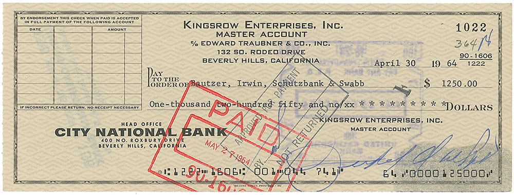 Kingsrow Enterprises, Inc., Master Account business check, 8.25 x 3, filled out in type and signed by Garland, payable to Bautzer, Irwin, Schutzbank, & Swabb for $1250.00, April 30, 1964. In very good condition, with cancellation stamps to body, a couple touching beginning of signature, and a block of toning over last name. Pre-certified PSA/DNA and RR Auction COA.