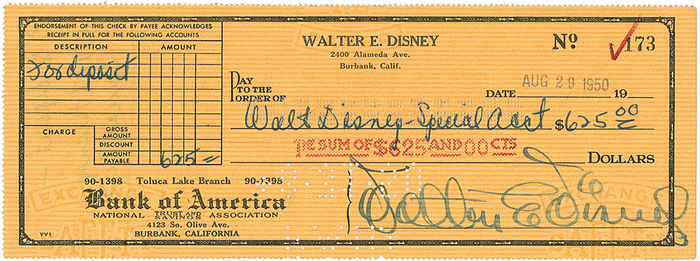 Personal check, 8.25 x 3, filled out in another hand and signed by Disney, “Walter E. Disney,” payable to the Walt Disney—Special Acct for $625.00, stamp-dated August 29, 1950. In fine condition, with expected stamps and holes, a few holes lightly touching beginning of signature, and a red check mark to top right. Pre-certified PSA/DNA and RR Auction COA.