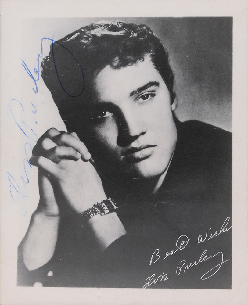 Vintage glossy 4 x 5 photo of a young Presley with his hands folded together, signed vertically in blue ballpoint. Photo also bears a pre-printed signature and sentiment and is encapusalted in a plastic SCG authentication holder. Skipping and irregular ink adhesion to first name of signature as well as beginning of last name, which remains mostly legible, otherwise fine condition. Accompanied by a letter of authenticity from James Spence. Pre-certified Roger Epperson/REAL and RR Auction COA.