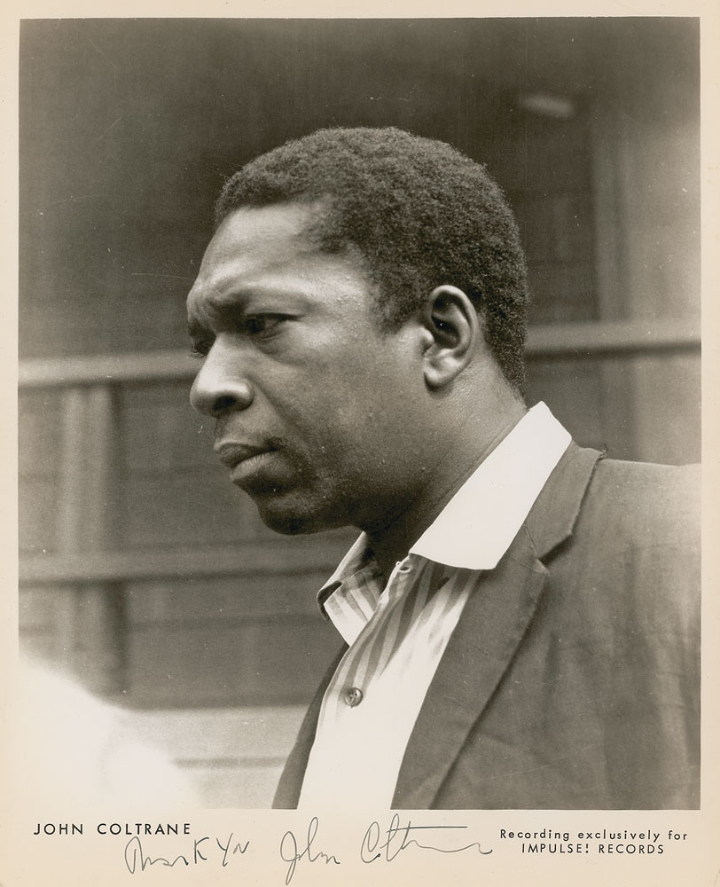 Saxophonist, band leader, and composer (1926–1967) whose brilliant improvisatory skills and experimental spirit made him one of the most influential and highly regarded musicians in the history of jazz. After playing tenor and soprano sax with Dizzy Gillespie, Miles Davis, and Thelonious Monk, he led his own groups and made such classic recordings as ‘Giant Steps,’ ‘My Favorite Things,’ and ‘A Love Supreme.’ He died of liver cancer at the age of 41. Vintage glossy 8 x 10 publicity photo of Coltrane outdoors, signed in the lower border in black ballpoint, “Thank you, John Coltrane.” In fine condition. This particular image was used as the cover image for his album A Love Supreme. Coltrane is extremely scarce in any autographed material, particularly in signed photos. Pre-certified Roger Epperson/REAL and RR Auction COA. Learn more about Larry Rafferty.