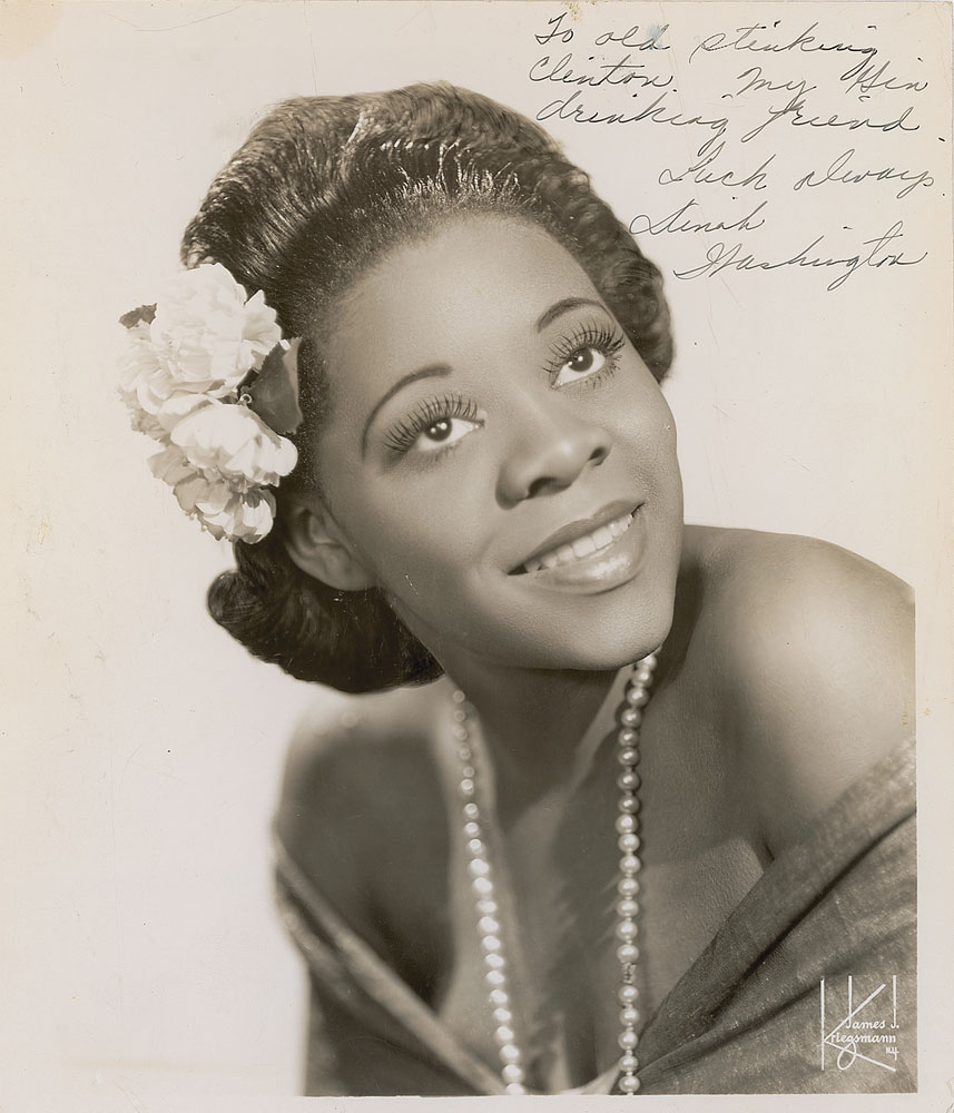 Legendary American singer (1924–1963), dubbed the Queen of the Blues, who died of an overdose of sleeping pills at the age of 39. Vintage glossy 8 x 9.25 photo, signed and inscribed in fountain pen, “To old stinking Clinton, my Gin drinking friend, Luck always, Dinah Washington.” In very good condition, with trimmed top edge, a couple light brushes and crease to inscription, and some other scattered light creases. A scarce photo made even more desirable by the unique inscription. Pre-certified PSA/DNA and RR Auction COA. Learn more about Larry Rafferty.