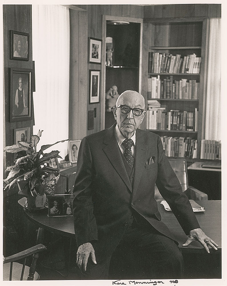 American psychiatrist (1893–1990) who pioneered a scientific approach to psychiatry and advocated the prevention of crime through psychiatric treatment rather than punishment. Satin-finish 8 x 10 photo of Menninger in his office, signed in the lower border in black ink, “Karl Menninger, MD.” In fine condition. Accompanied by a 1983 TLS from Menninger acknowledging the photo. RR Auction COA.