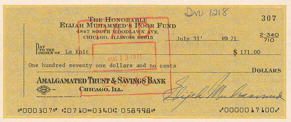 The Honorable Elijah Muhammad’s Poor Fund business check, 7 x 3, filled out in type and signed by Muhammad, payable to Le Knit for $171.00, July 31, 1971. In fine condition, with a bank stamp to body, just slightly touching beginning of signature, and a small ink notation at top. Accompanied by a color 9.75 x 12 print of Muhammad bearing his pre-printed signature, but being hand-signed by the artist, his grandson, Jesus Muhammad-Ali. Pre-certified PSA/DNA and RR Auction COA.
