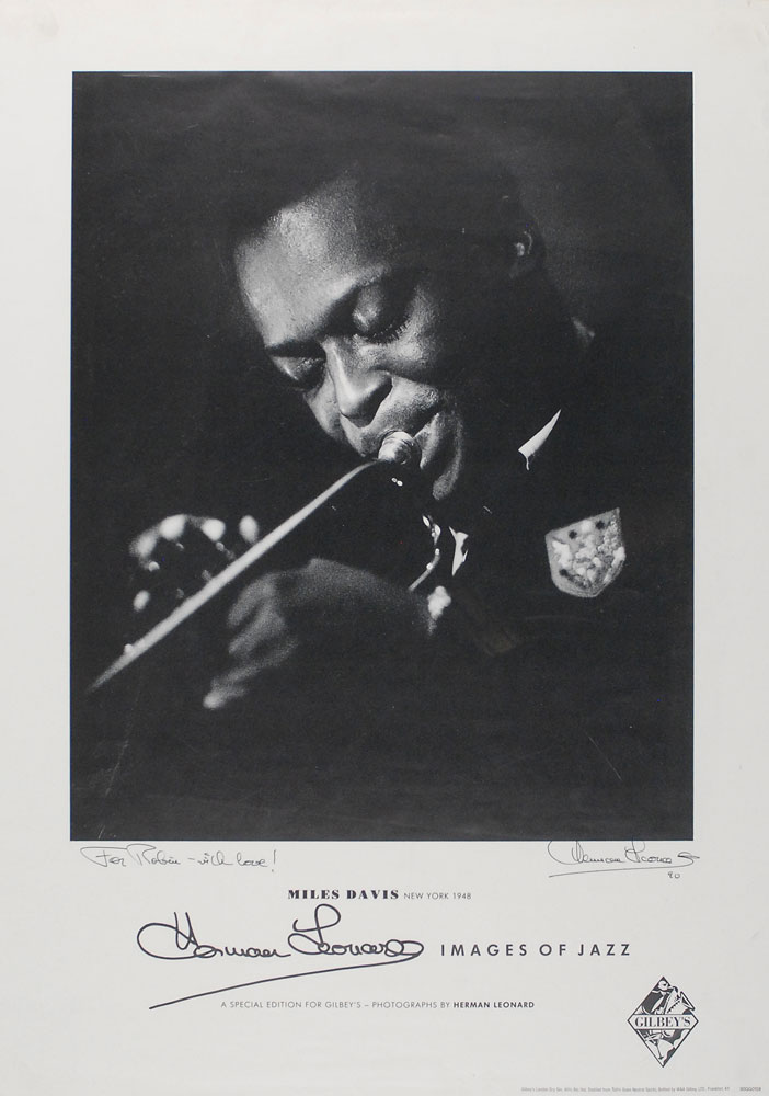 Poster advertising a 1990 exhibition of Leonard’s photographs entitled ‘Images of Jazz,’ 16.5 x 23.5, featuring his image of Miles Davis from 1948, signed and inscribed in black felt tip, “For Robin—with love! Herman Leonard, 90.” Some creases to edges and unobtrusive ‘thumbprint’ marks to corners, otherwise fine condition. RR Auction COA. Learn more about Larry Rafferty.