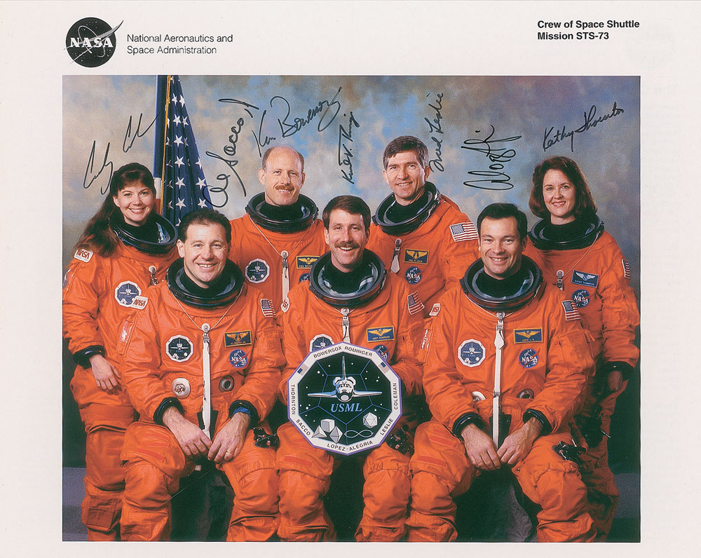 Color 10 x 8 NASA photo of the crew in their orange flight suits, signed in black felt tip by all seven: Ken Bowersox, Kent V. Rominger, Kathryn C. Thornton, Catherine G. Coleman, Michael Lopez-Alegria, Fred W. Leslie, and Albert Sacco Jr. In fine condition. Pre-certified Steve Zarelli and RR Auction COA.