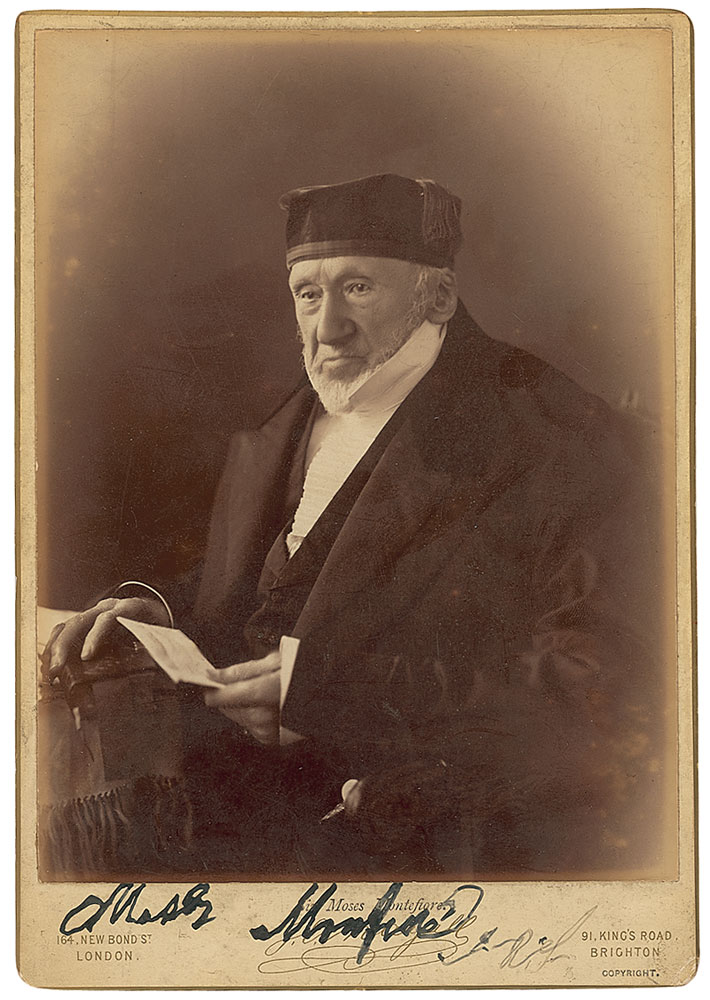 One of the most famous British Jews of the 19th century (1784–1885), Montefiore was a financier, banker, philanthropist, and Sheriff of London. Original 6.75 x 9.75 cabinet-style half-length portrait of Montefiore, boldly signed on the mount in black ink, “Moses Montefiore, F. R. S.” Published by J. E. Mayall of London. Some scattered dings and soiling, otherwise fine condition. A scarce format. RR Auction COA.