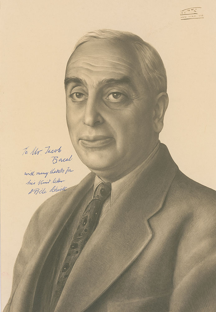 American pediatrician (1877–1967) who devised the Schick test to determine susceptibility to diphtheria and also coined the term ‘allergy.’ Vintage matte-finish 6.5 x 9.5 photo of Schick, signed and inscribed in blue ballpoint, “To Mr. Jacob Bacal, with many thanks for his kind letter, Dr. Bela Schick.” In fine condition. Accompanied by the original mailing envelope. RR Auction COA.