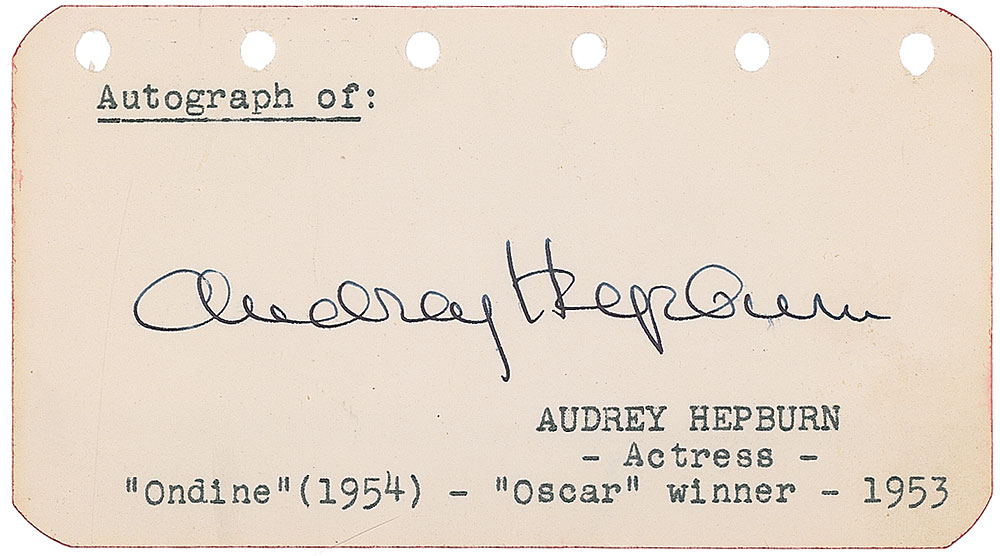 Terrific vintage fountain pen signature, “Audrey Hepburn,” on an off-white 4.5 x 2.5 page. In fine condition. Pre-certified PSA/DNA and RR Auction COA.