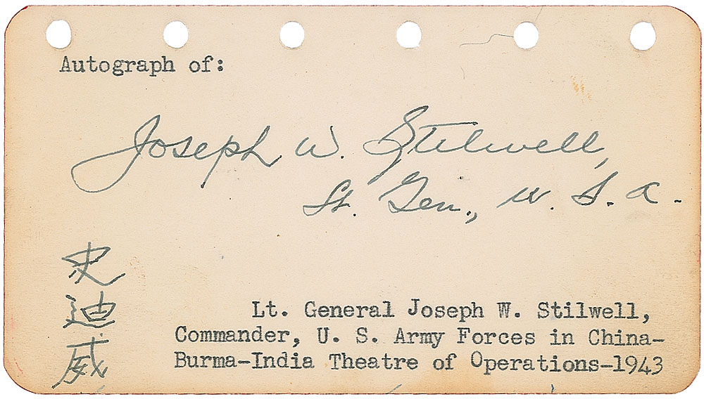 Vintage fountain pen signature, “Joseph W. Stilwell, Lt. Gen., U. S. A.,” also adding his name in Chinese, on an off-white 4.5 x 2.5 page. In fine condition, with light edge toning. RR Auction COA.