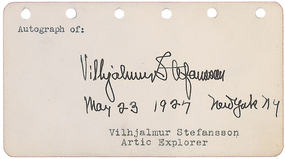 Canadian explorer and ethnologist (1879–1962) best known for his expeditions to the Arctic and for his studies of the native peoples there. Bold vintage fountain pen signature, “Vilhjalmur Stefansson, May 23, 1927, New York, NY,” on an off-white 4.5 x 2.5 page. In fine condition. RR Auction COA.