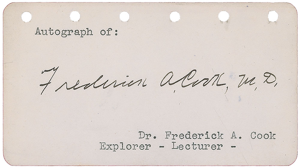 Explorer and physician (1865–1940) who claimed to have reached the North Pole a year before Peary. His claim was later rejected on grounds of insufficient evidence. Vintage ink signature, “Frederick A. Cook, M. D.,” on an off-white 4.5 x 2.5 page. In fine condition. RR Auction COA.