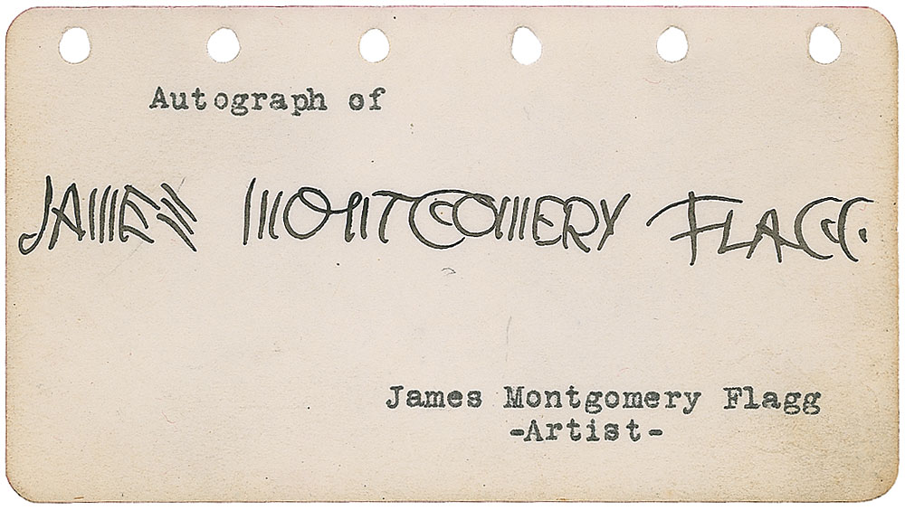 Instantly recognizable vintage ink signature, “James Montgomery Flagg,” on an off-white 4.5 x 2.5 page. In fine condition, with a bit of light edge toning. RR Auction COA.