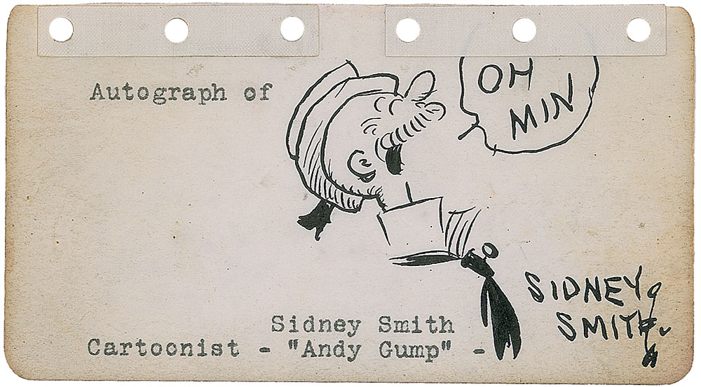 Original vintage signed ink sketch of Andy Gump saying, “Oh Min!” on an off-white 4.5 x 2.5 page. In fine condition, with some light edge toning and reinforcement tabs to punch holes along top edge. RR Auction COA.