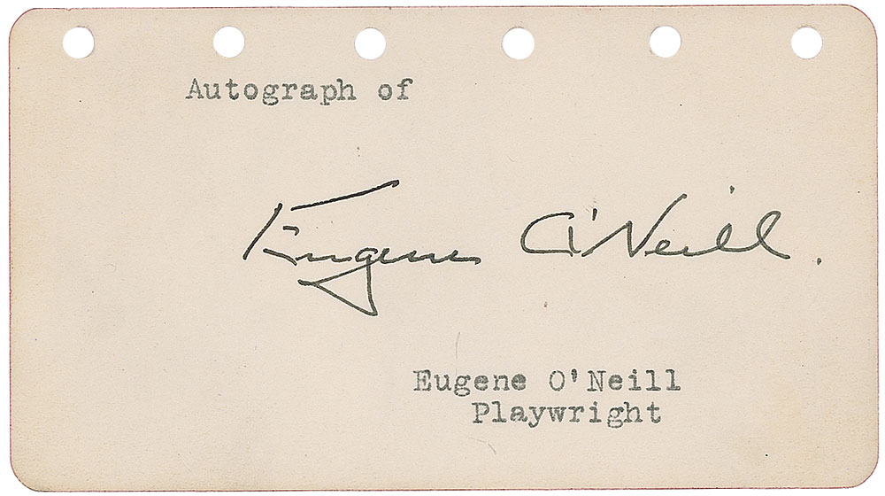 Crisp vintage ink signature, “Eugene O’Neill,” on an off-white 4.5 x 2.5 page. In fine condition. RR Auction COA.