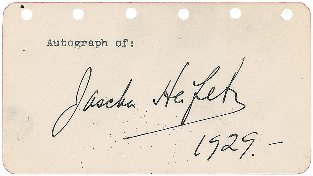 Vintage fountain pen signature, “Jascha Heifetz 1929,” on an off-white 4.5 x 2.5 page. In fine condition, with some stray ink flecks under signature. RR Auction COA.