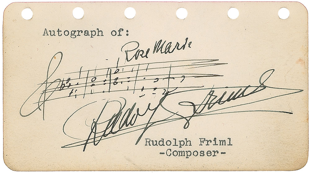 AMQS on an off-white 4.5 x 2.5 page. Friml pens five bars of music from his opera ‘Rose Marie,’ signing under the quote. In fine condition, with some slight edge toning. RR Auction COA.