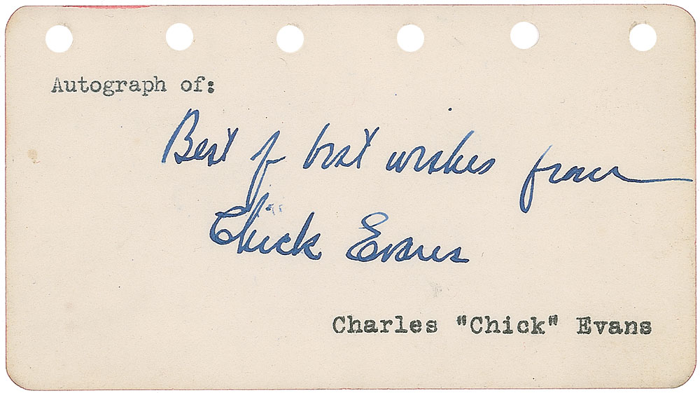 Golfer (1890–1979) who was the first to win the US Open and US Amateur in the same year. Vintage fountain pen signature, “Best of best wishes from Chick Evans,” on an off-white 4.5 x 2.5 page. In fine condition. Pre-certified Steve Grad/PSA/DNA and RR Auction COA.
