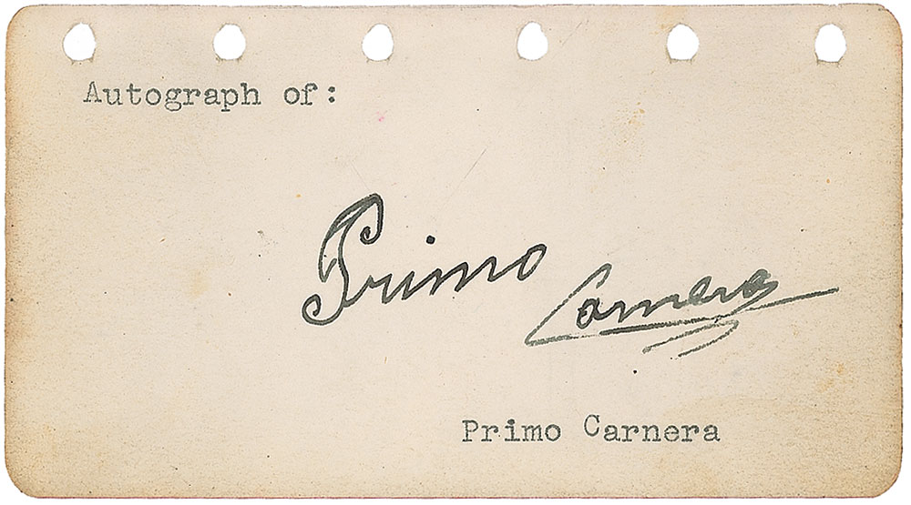 Vintage fountain pen signature, “Primo Carnera,” on an off-white 4.5 x 2.5 page. In fine condition, with a bit of toning and soiling to lower corners. Pre-certified Steve Grad/PSA/DNA and RR Auction COA.
