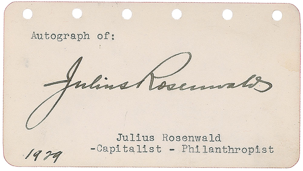 Clothier, manufacturer, and philanthropist (1862–1932) best known as a part-owner of Sears, Roebuck and Company. Vintage fountain pen signature, “Julius Rosenwald, 1929,” on an off-white 4.5 x 2.5 page. In fine condition. RR Auction COA.