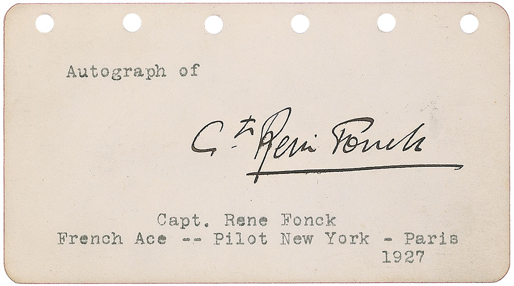 French aviator who ended WWI as the top Allied fighter ace (1894–1953). Bold vintage ink signature, “Ct. Rene Fonck,” on an off-white 4.5 x 2.5 page. In fine condition. RR Auction COA.
