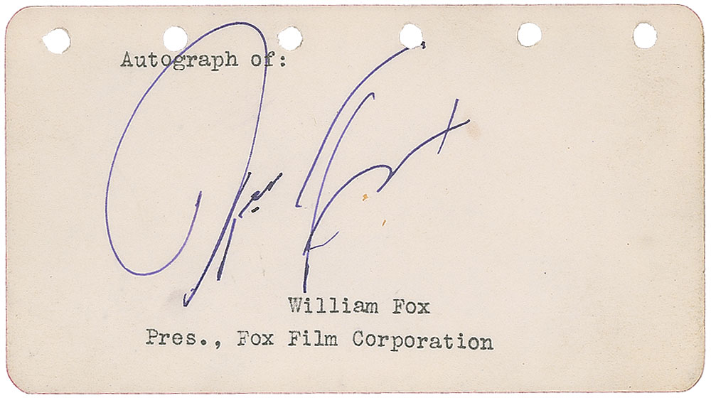 Pioneering motion picture executive (1879–1952) who founded the Fox Film Corporation in 1915. Vintage ink signature, “Wm. Fox,” on an off-white 4.5 x 2.5 page. In fine condition. Pre-certified PSA/DNA and RR Auction COA.