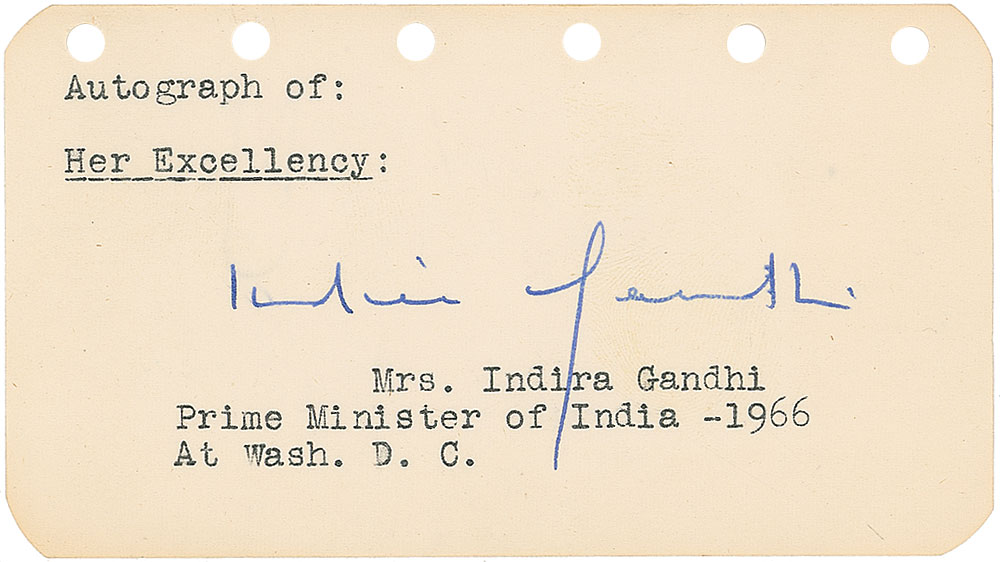Vintage ballpoint signature, “Indira Gandhi,” on an off-white 4.5 x 2.5 page. In fine condition. RR Auction COA.