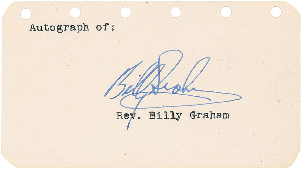 Ink signature, “Billy Graham,” on an off-white 4.5 x 2.5 page. In fine condition. RR Auction COA.