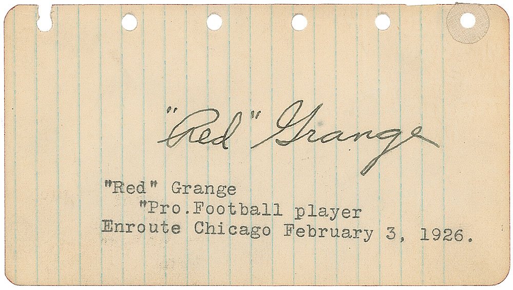 Vintage fountain pen signature, “‘Red’ Grange,” on an off-white 4.5 x 2.5 lined page. Even overall toning and a small tear and reinforcement to binding holes, otherwise fine condition. Pre-certified Steve Grad/PSA/DNA and RR Auction COA.