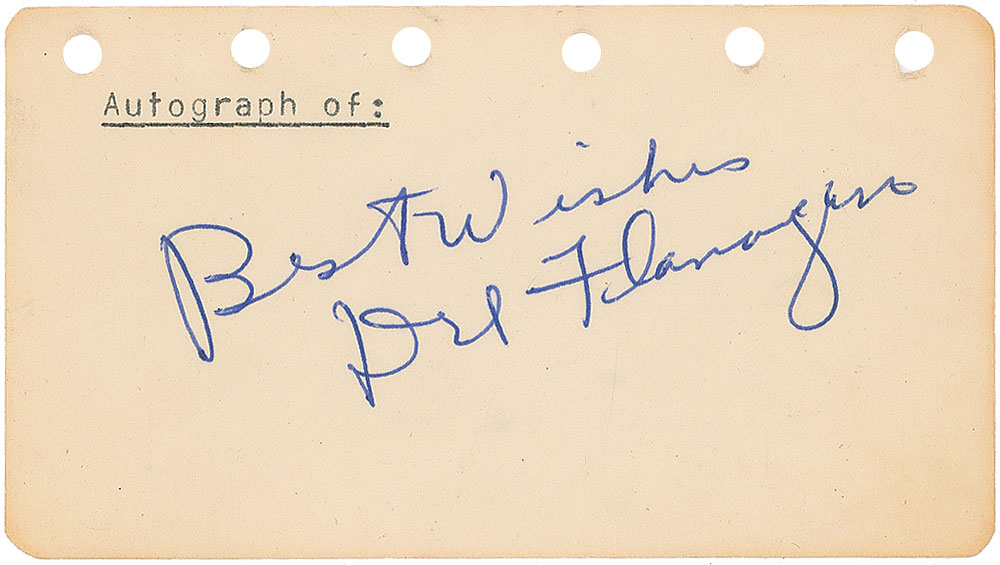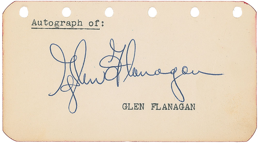 Professional boxing brothers from Minnesota who are both members of the World Boxing Hall of Fame. Vintage ballpoint signatures, “Best Wishes, Del Flanagan” and “Glen Flanagan,” on individual off-white 4.5 x 2.5 pages. In overall fine condition. RR Auction COA.
