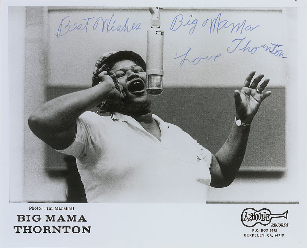 Glossy 10 x 8 Arhoolie Records publicity photo of Thornton in a recording studio, signed in black felt tip, “Best Wishes, Love Big Mama Thornton.” In fine condition, with overall surface bends and creases. RR Auction COA. Learn more about Larry Rafferty.