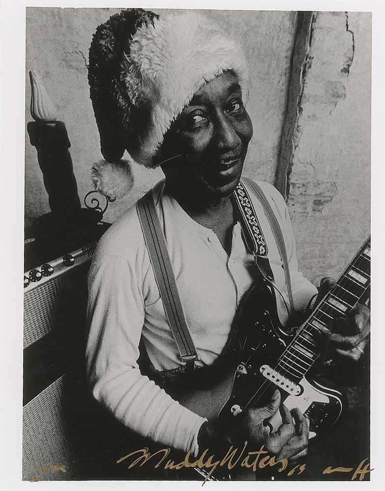Glossy 11 x 14 Peter Amft photo of Waters wearing a Santa hat and playing his guitar, notated and signed in gold ink by the photographer, “Muddy Waters 69, Amft.” In fine condition. RR Auction COA. Learn more about Larry Rafferty.