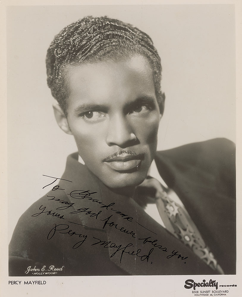 Songwriter (1920–1984) best known for the song ‘Hit the Road Jack.’ Vintage glossy 8 x 10 publicity photo, signed and inscribed in fountain pen, “To Grandma—may God forever bless you, Yours, Percy Mayfield.” In very good condition, with several noticeable vertical creases, one through a single letter of signature, and a few surface dings. RR Auction COA. Learn more about Larry Rafferty.