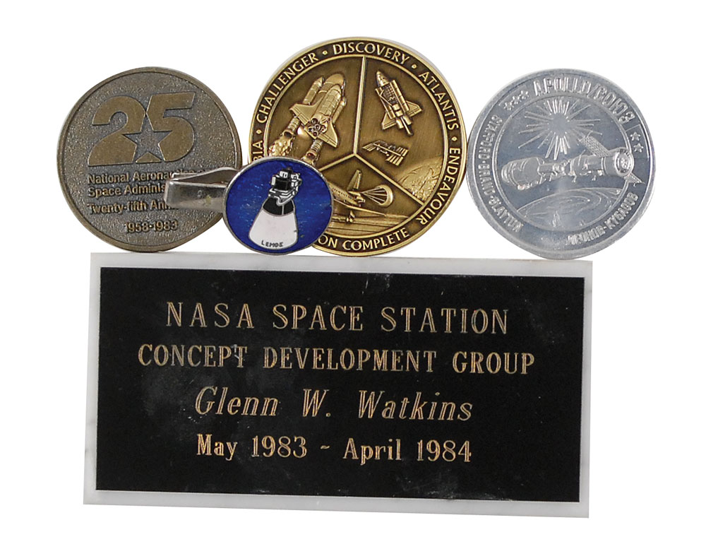 Six items from the personal collection of NASA Chief Engineer of Operations, Glenn Watkins: commemorative medallion celebrating the Space Shuttle program, containing metal flown on a mission; Apollo-Soyuz medallion containing metal from both Apollo and Soyuz spacecrafts; medallion commemorating the 25th anniversary of NASA, containing metal flown aboard the Space Shuttle Columbia, November 11–16, 1982; vintage tie clasp featuring an image of the Lunar Module Descent Engine built by TRW; marble block with a plaque that reads, “NASA Space Station Concept Development Group, Glenn W. Watkins, May 1983–April 1984”; and an audio CD of the Mission Control voice loops for ascent and descent during the first lunar landing. In overall fine condition. The consignor, Glenn Watkins, was the NASA Apollo Flight Controller and notes that of personal interest and rarity is the LM-Descent Engine pin. RR Auction COA.