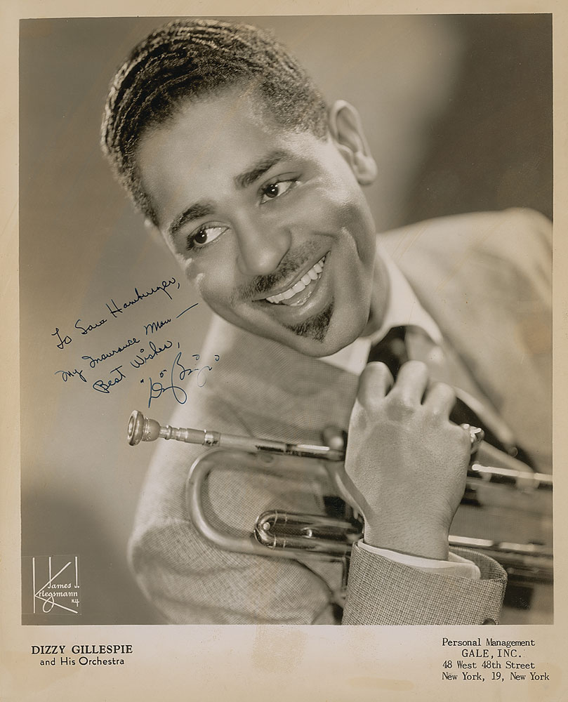 Vintage glossy 8 x 10 photo of Gillespie and his trumpet, signed and inscribed in fountain pen, “To Sara Hamburger, My insurance man—Best wishes, Dizzy Gillespie.” In fine condition, with some mild toning to bottom border and mounting remnants to reverse. Pre-certified PSA/DNA and RR Auction COA. Learn more about Larry Rafferty.
