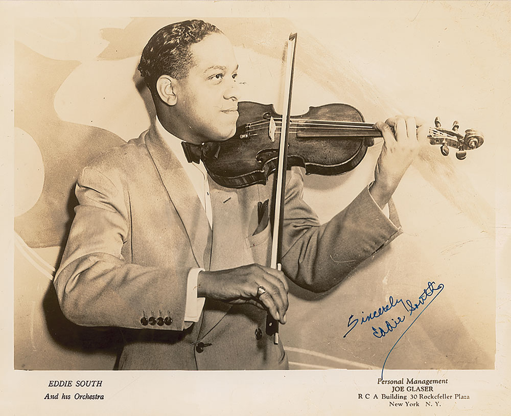 Jazz violinist (1904–1962) known for playing in multiple jazz orchestras and big bands, and for recording with legends like Django Reinhardt and Stephane Grappelli. Vintage glossy 10 x 8 publicity photo of South posing with his violin, signed in fountain pen, “Sincerely, Eddie South.” Scattered creases and surface wrinkles, otherwise fine condition. RR Auction COA. Learn more about Larry Rafferty.