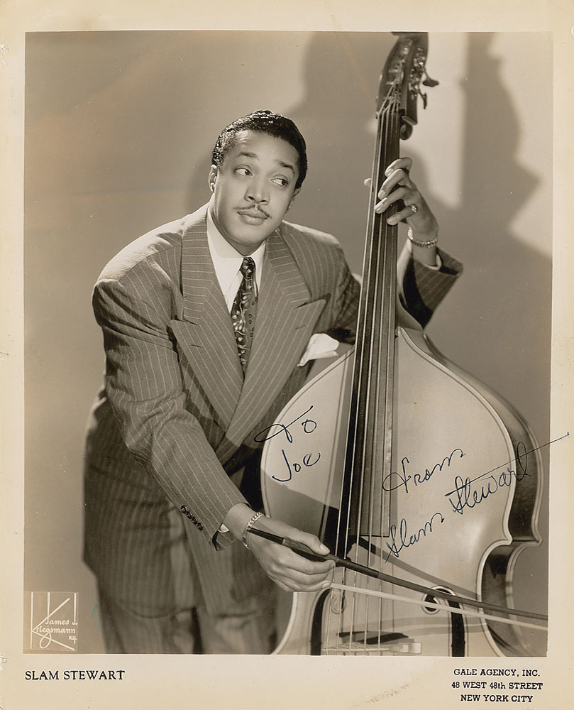Innovative jazz bass player (1914–1987). Vintage glossy 8 x 10 publicity photo of Stewart bowing his bass, signed and inscribed in fountain pen, “To Joe, from Slam Stewart.” Binder dings to left edge and a few slight creases, otherwise fine condition. RR Auction COA. Learn more about Larry Rafferty.