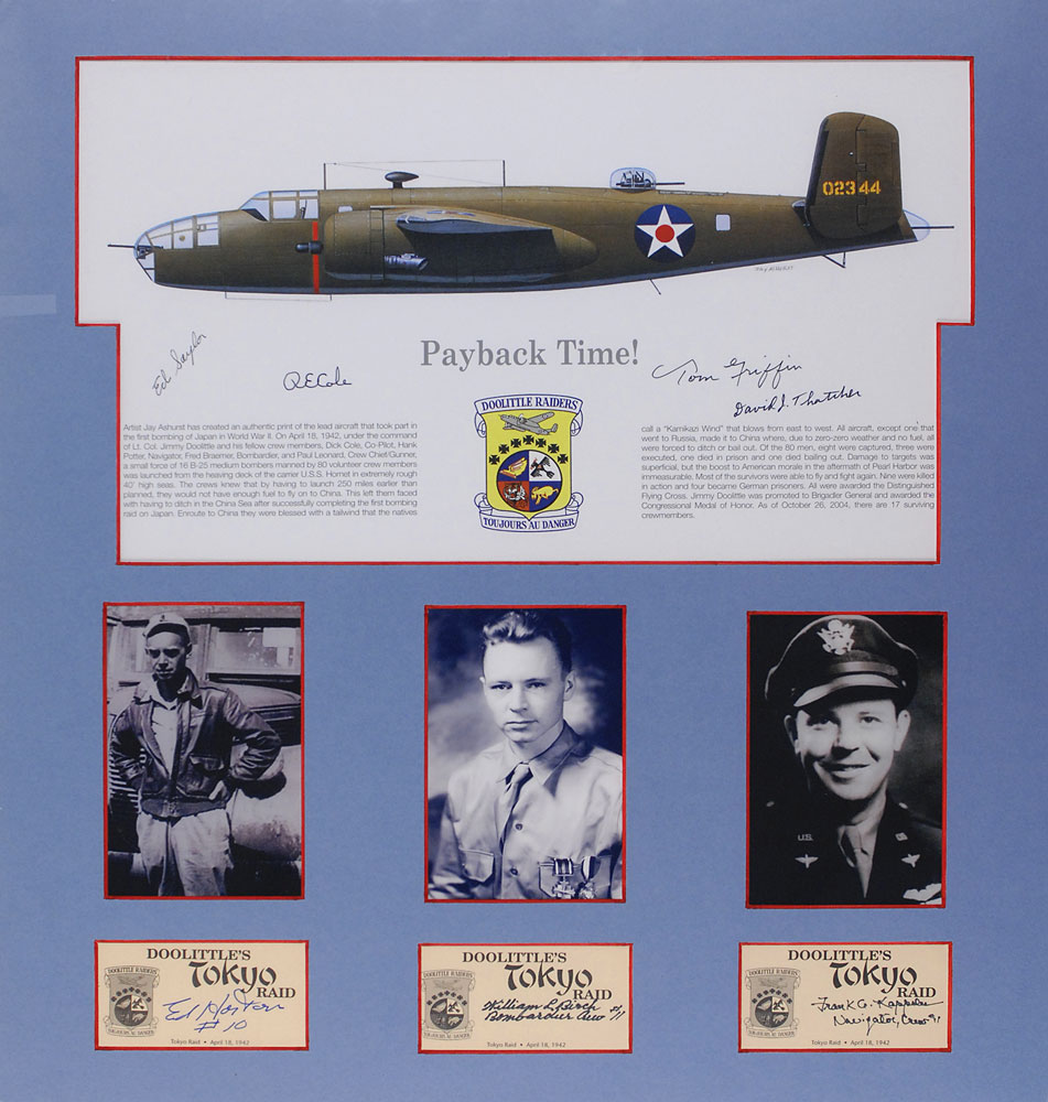 Color 16 x 9.25 print entitled ‘Payback Time!,’ signed in black felt tip by Ed Saylor, R. E. Cole, Tom Griffin, and David J. Thatcher; and felt tip signatures of Ed Horton, William L. Birch, and Frank A. Kappeler on individual off-white 3.5 x 2 custom-made collector’s cards. Matted together with photos of the latter three to an overall size of 19 x 21. In overall fine condition. RR Auction COA.