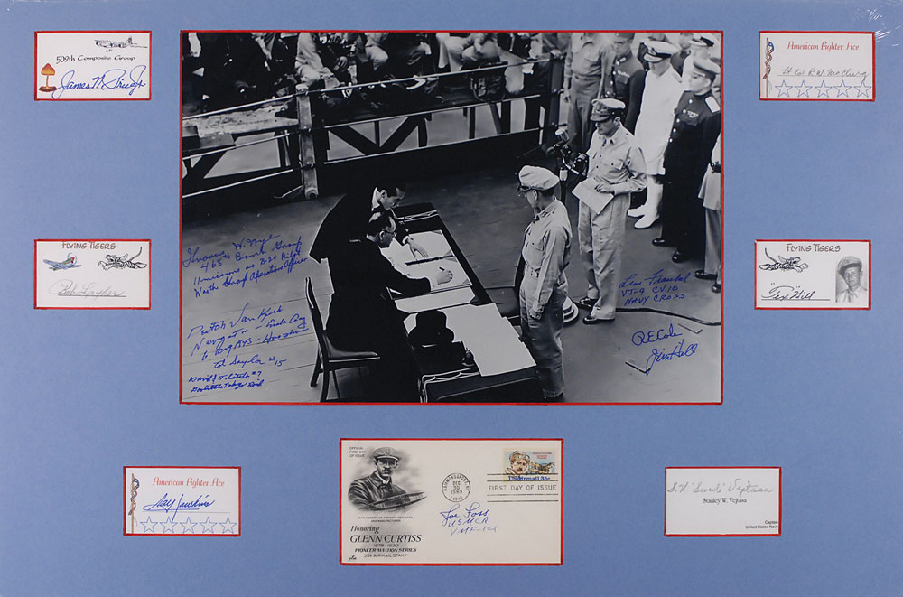Collection of items consisting of a signed photo, commemorative cover, and pencil and ink signatures. A glossy 15.25 x 10.5 photo of the signing of the Japanese surrender, signed in blue felt tip by Dutch Van Kirk, Ed Saylor, David Thatcher, R. E. Cole, Leon Frankel, Francis Nye, and Jim Hill; FDC signed in blue felt tip by Joe Foss; and signatures of James N. Price, Jr., Bob Layer, Arthur Ray Hawkins, S. W. ‘Swede’ Vejtasa, Tex Hill, and R. W. McClurg on individual white custom-made collector’s cards. All are matted together to an overall size of 26 x 17. In overall fine condition. Oversized. RR Auction COA.