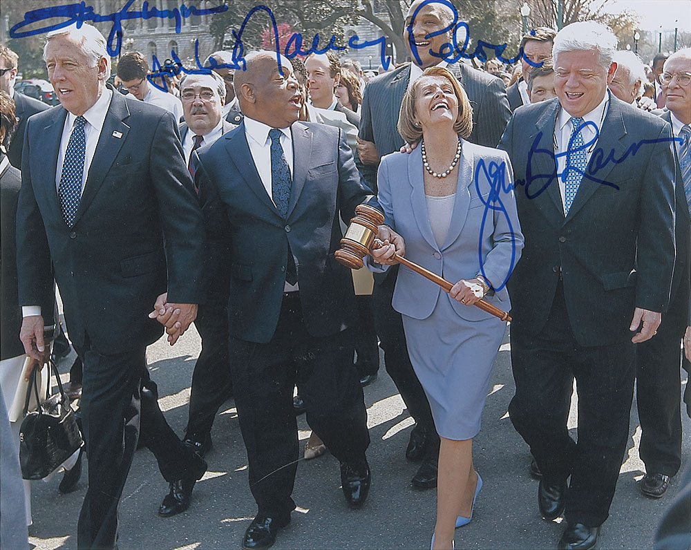 Famous color glossy 10 x 8 photo of congressional Democrats walking into the Capitol to vote on the ‘Obamacare’ bill, signed in blue felt tip by Nancy Pelosi (Speaker of the House), Steny Hoyer (Majority Leader), John Lewis, and John Larson (Chair of the House Democratic Caucus). In very fine condition. RR Auction COA.