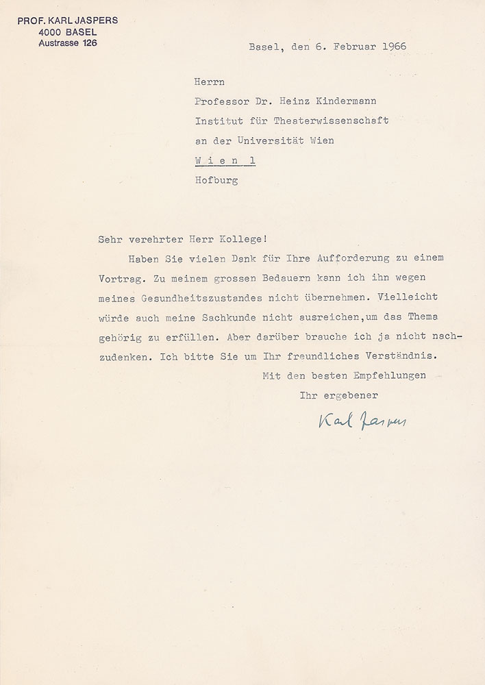 German psychiatrist and philosopher (1883–1969) who attempted to discover an innovative philosophical system. TLS in German, one page, 8.25 x 11.75, stamped personal letterhead, February 6, 1966. Untranslated letter to Dr. Heinz Kindermann. In fine condition, with central vertical and horizontal folds. RR Auction COA.
