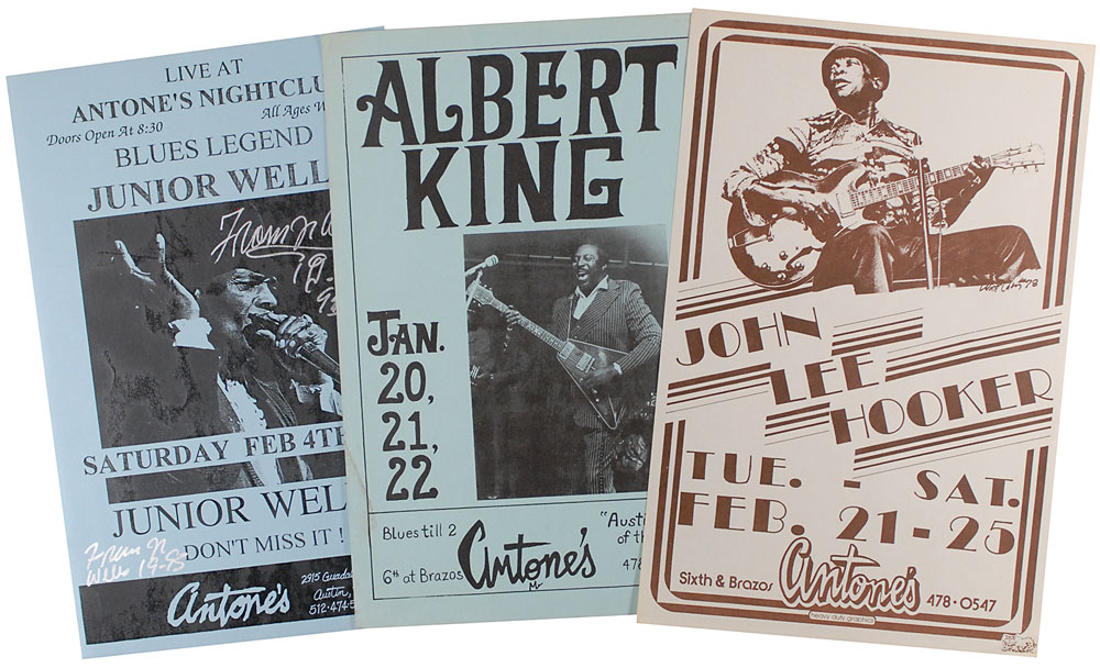 Three original posters (one signed) for performances by legendary bluesmen at Antone’s Nightclub in Austin, Texas, each measuring approximately 11 x 17, some dates unknown. Posters are for the following shows: John Lee Hooker, February 21–25, 1978; Albert King, January 20–22; and Junior Wells, February 4, 1995, signed twice in silver ink by Wells. In overall fine condition, with some toned adhesive remnants and crease to the King poster. Originate from the personal collection of Clifford Antone, founder of the club. RR Auction COA. Learn more about Larry Rafferty.