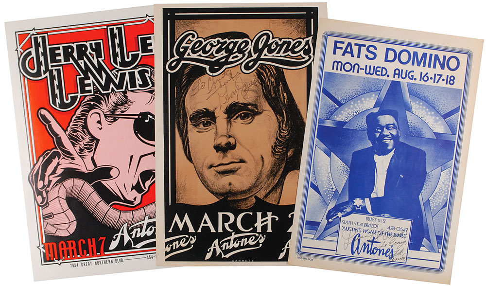 Three original posters (two signed) for performances by legendary musicians at Antone’s Nightclub in Austin, Texas, each measuring approximately 11 x 17, some dates unknown. Posters are for the following shows: George Jones, March 28, 1979, signed and inscribed in black felt tip, “To Christopher, Thanks, George Jones”; Fats Domino, August 16–18, signed and inscribed in black ink, “Love, Fats Domino. To Craig, Fats Domino”; and Jerry Lee Lewis, March 7, 1980. In overall fine condition. Originate from the personal collection of Clifford Antone, founder of the club. RR Auction COA. Learn more about Larry Rafferty.
