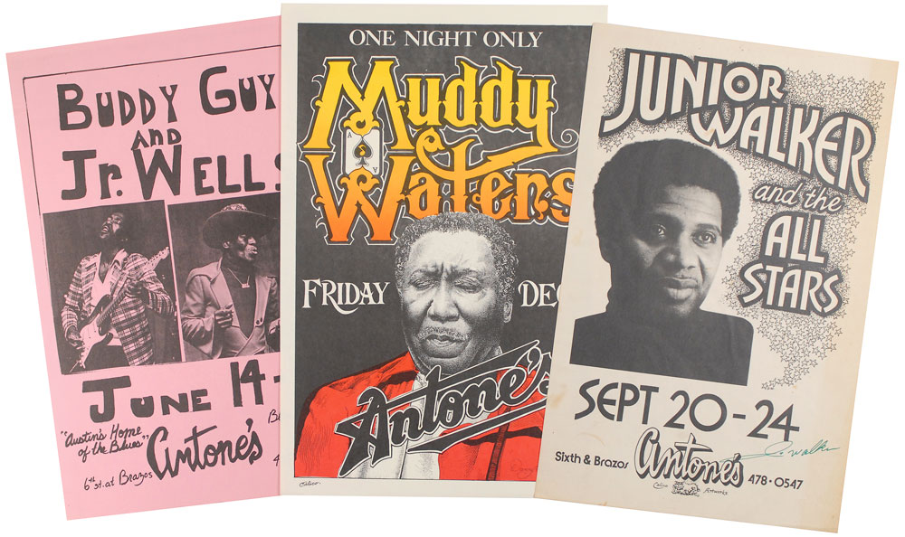 Three original posters (one signed) for performances by famous blues artists at Antone’s Nightclub in Austin, Texas, each measuring approximately 11 x 17, some dates unknown. Posters are for the following shows: Muddy Waters, December 7, 1978; Buddy Guy and Jr. Wells, June 14–18; and Junior Walker and the All Stars, September 20–24, signed in green felt tip by Walker. In overall fine condition, with a few stains and toning to the Walker poster. Originate from the personal collection of Clifford Antone, founder of the club. RR Auction COA. Learn more about Larry Rafferty.