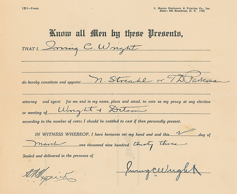 Tennis player (1882–1953) who partnered with Molla Bjurstedt to win the 1917 US National Championship in mixed doubles by defeating Bill Tilden and Florence Ballin. Rare partly-printed DS, signed “Irving C. Wright,” one page, 8.25 x 7, March 2, 1933. Wright appoints “N. Streahl or T. D. Parkman attorney and agent for me and in my name, place and stead, to vote as my proxy at any election or meeting of Wright & Ditson.” Signed at the conclusion by Wright. In fine condition, with expected document wear. Pre-certified Steve Grad/PSA/DNA and RR Auction COA.