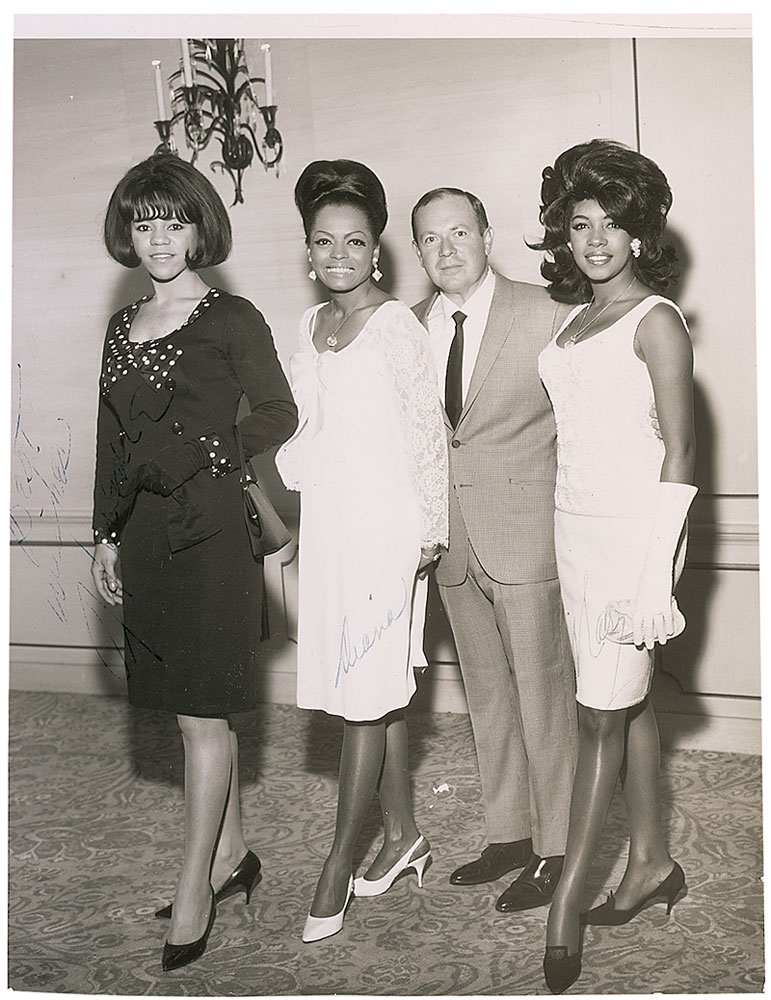 Vintage glossy 7.25 x 9.5 photo of the trio posing with a man, signed in blue ink, “Best wishes, Florence,” “Diana,” and “Mary.” Also signed and inscribed on the reverse, “To Jules, best wishes, Love Florence, Supremes,” “Diana,” and “Mary.” In very good condition, with trimmed edges, irregular ink adhesion to all three signatures on the front, resulting in light but legible signatures, poor contrast to Florence’s signature on the front, and scattered creases and surface impressions. Pre-certified Roger Epperson/REAL and RR Auction COA.