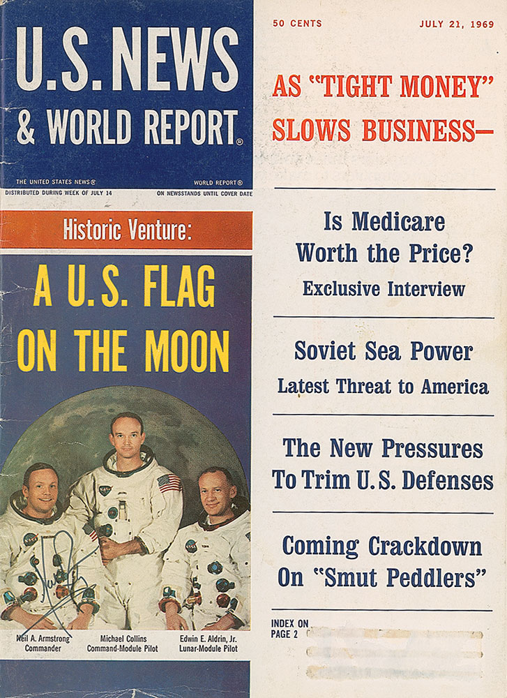 U. S. News and World Report magazine, 8 x 11, 84 pages, dated July 21, 1969, featuring an image of the Apollo 11 crew on the cover. Signed on the image on the front cover in black felt tip by Armstrong. In fine condition, with mailing label adhesive remnant to lower right of front cover and light handling wear. Pre-certified Steve Zarelli and RR Auction COA.